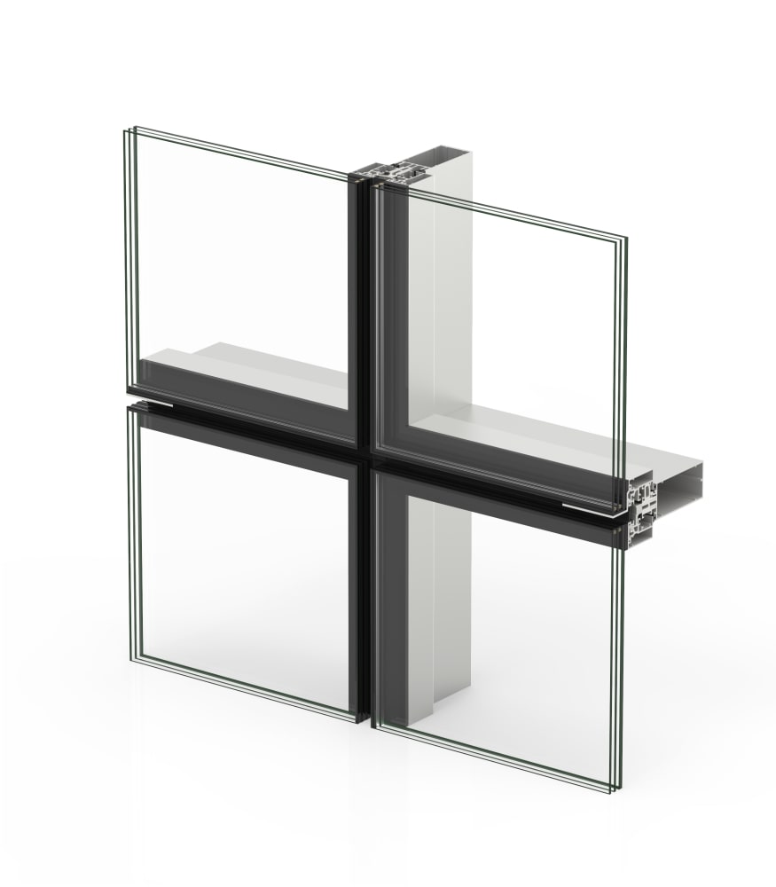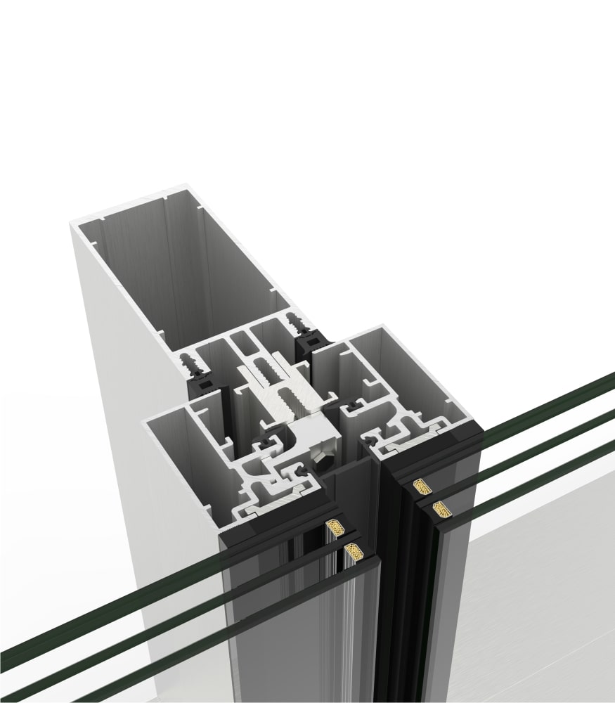 » Múltiples uniones mecánicas de los perfiles que posibilitan fachadas en vertical, con inclinación, poligonales y modulaciones con vidrios de gran tamaño y peso.