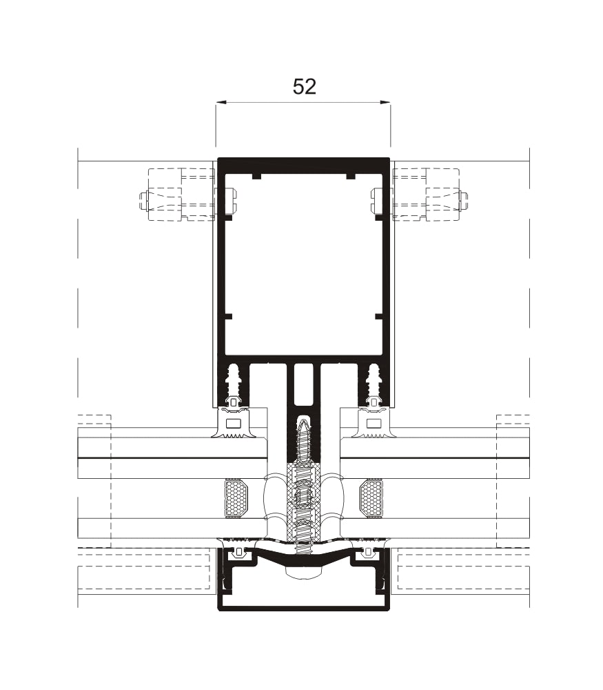 » Fijación de vidrio con preso continuo atornillado a montantes y travesaños oculto por tapete embellecedora.