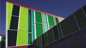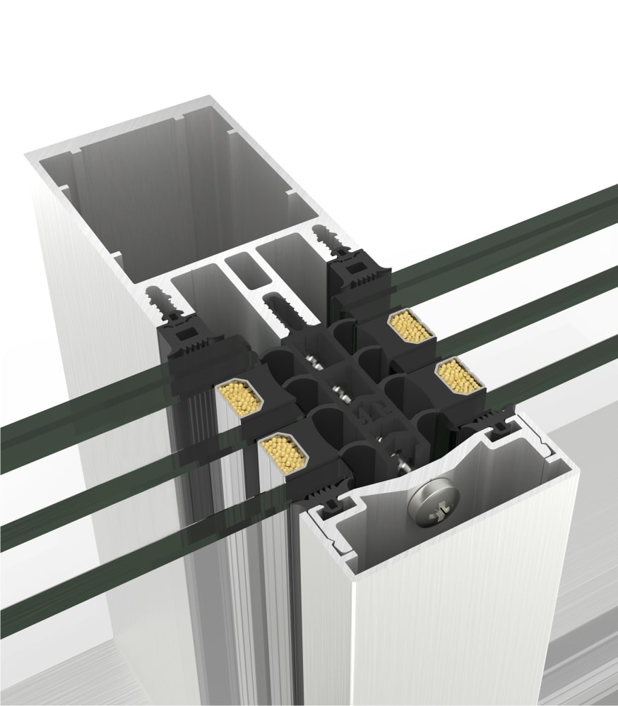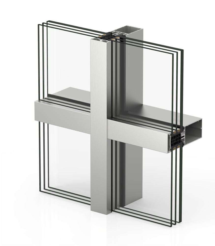 » Múltiples uniones mecánicas de los perfiles que posibilitan fachadas en vertical, con inclinación, poligonales y modulaciones con vidrios de gran tamaño y peso.