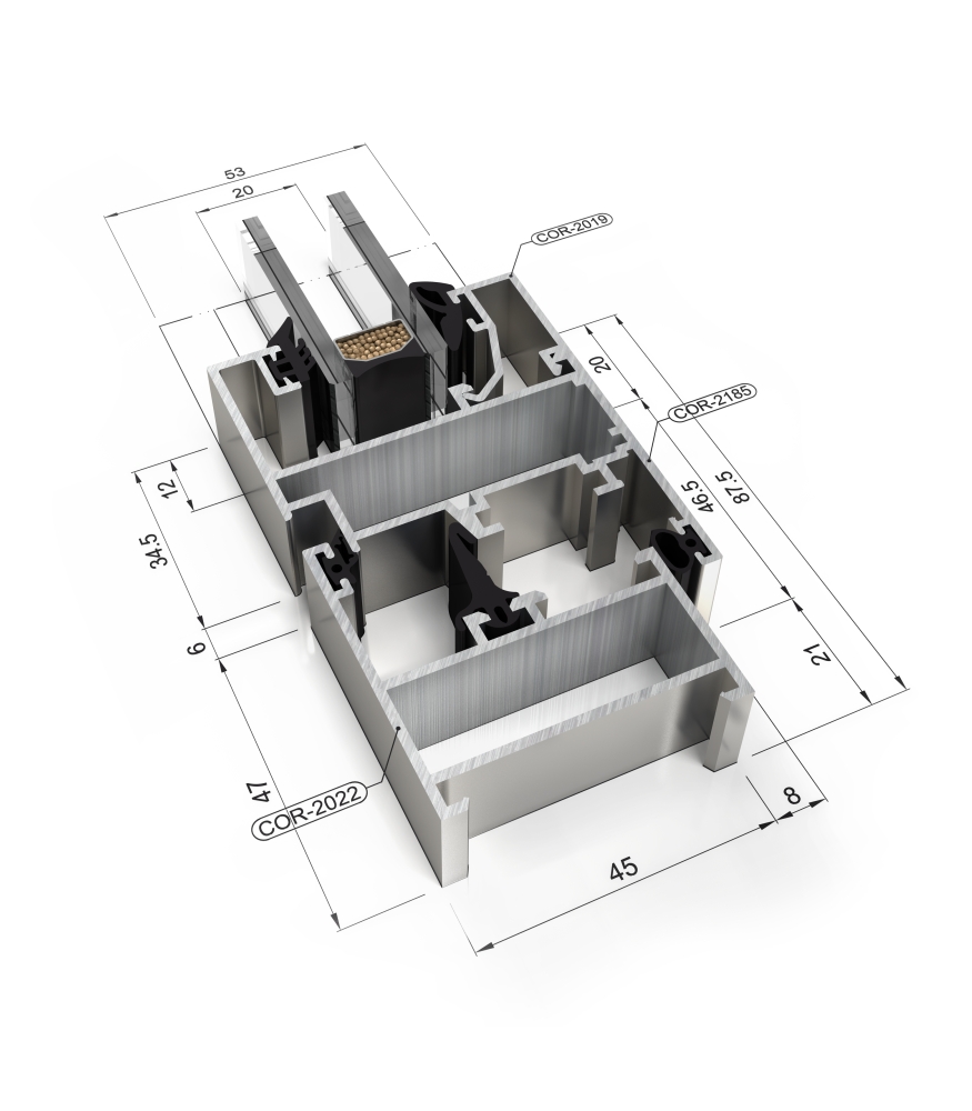 Cuenta con un sistema de triple junta de estanquidad que ofrece gran protección en frente de los agentes atmosféricos y un espesor de perfilería de uno con cinco mm para ventanas y uno con siete mm para puertas.