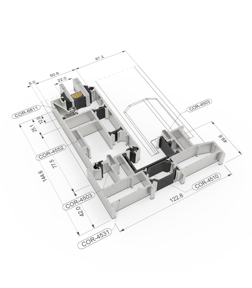 4500 corredera elevable que fundamenta su funcionamiento en un sistema en el que las hojas se montan con un mecanismo que deja la elevación de exactamente la misma en la maniobra de apertura y el descenso en la de cierre, de forma que la puerta cerrada descansa sobre juntas de estanquidad longitudinales inferiores y superiores produciéndose su enclavamiento en cualquier situación.