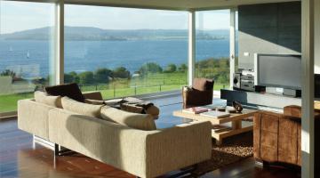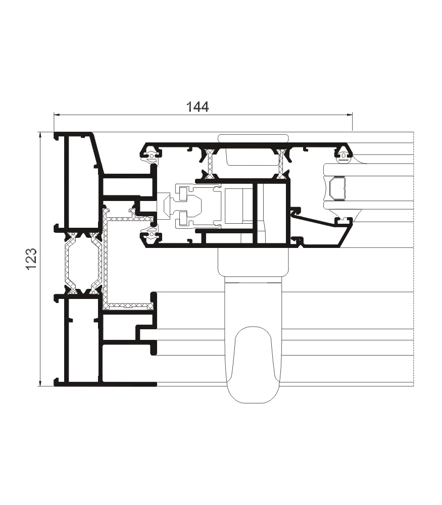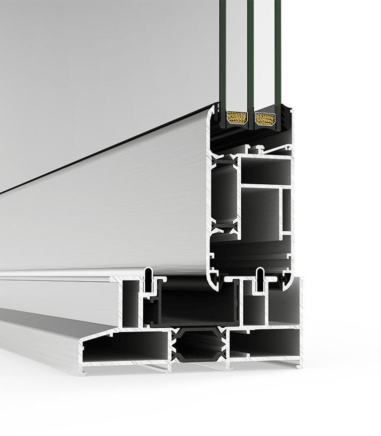 Puerta corredera de aluminio con ruptura de puente térmico que permite estética achaflanada o bien curva en hojas y junquillos.